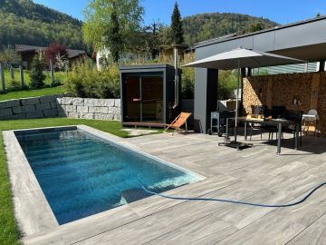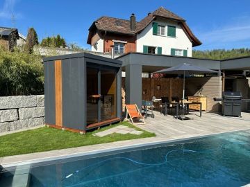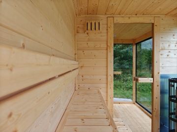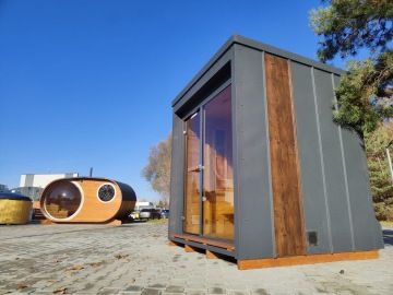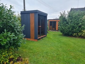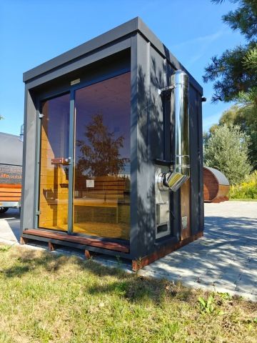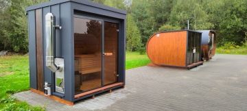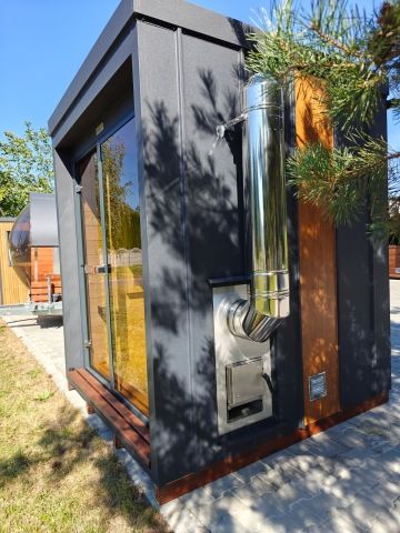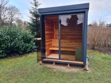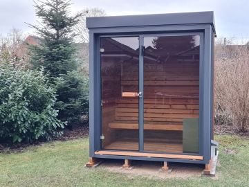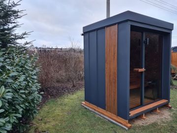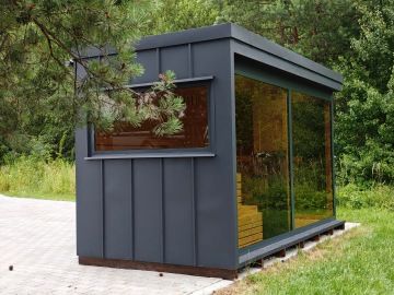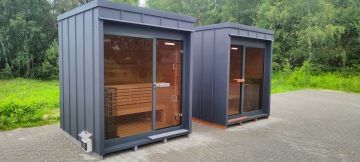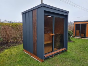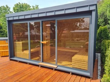 Nový moderní typ panoramatické venkovní sauny Diamant se zateplenou dřevěnou konstrukcí a typickým venkovním oplechováním. Základní rozměr od 200 × 200 cm, s možností výroby i jako větší saunový domek s odpočívárnou.