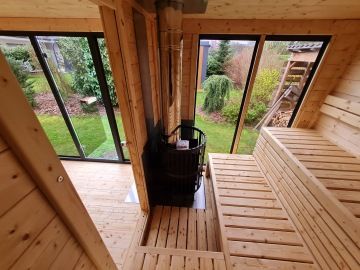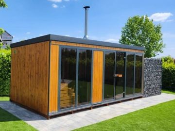 Stylová panoramatická venkovní sauna s dřevěnou konstrukcí – v provedení ze severského smrku nebo Thermowoodu.